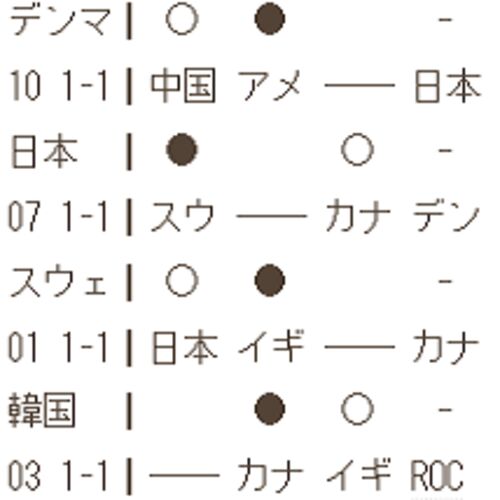 平昌五輪の時に引き続き、北京五輪のカーンリグ女子、予選リーグの順位表をテキスト形式で作ってみました。 女子予選リーグ ■女子┃10朝 10夜 11昼 12朝 12夜 13昼 14朝 14夜 15昼 16朝 16夜 17昼 スイス┃ ○ ○ ○ ○ ○ ● ○ ○ ○ ☆ 8-1┃イギ 中国 ROC ―― デン カ…